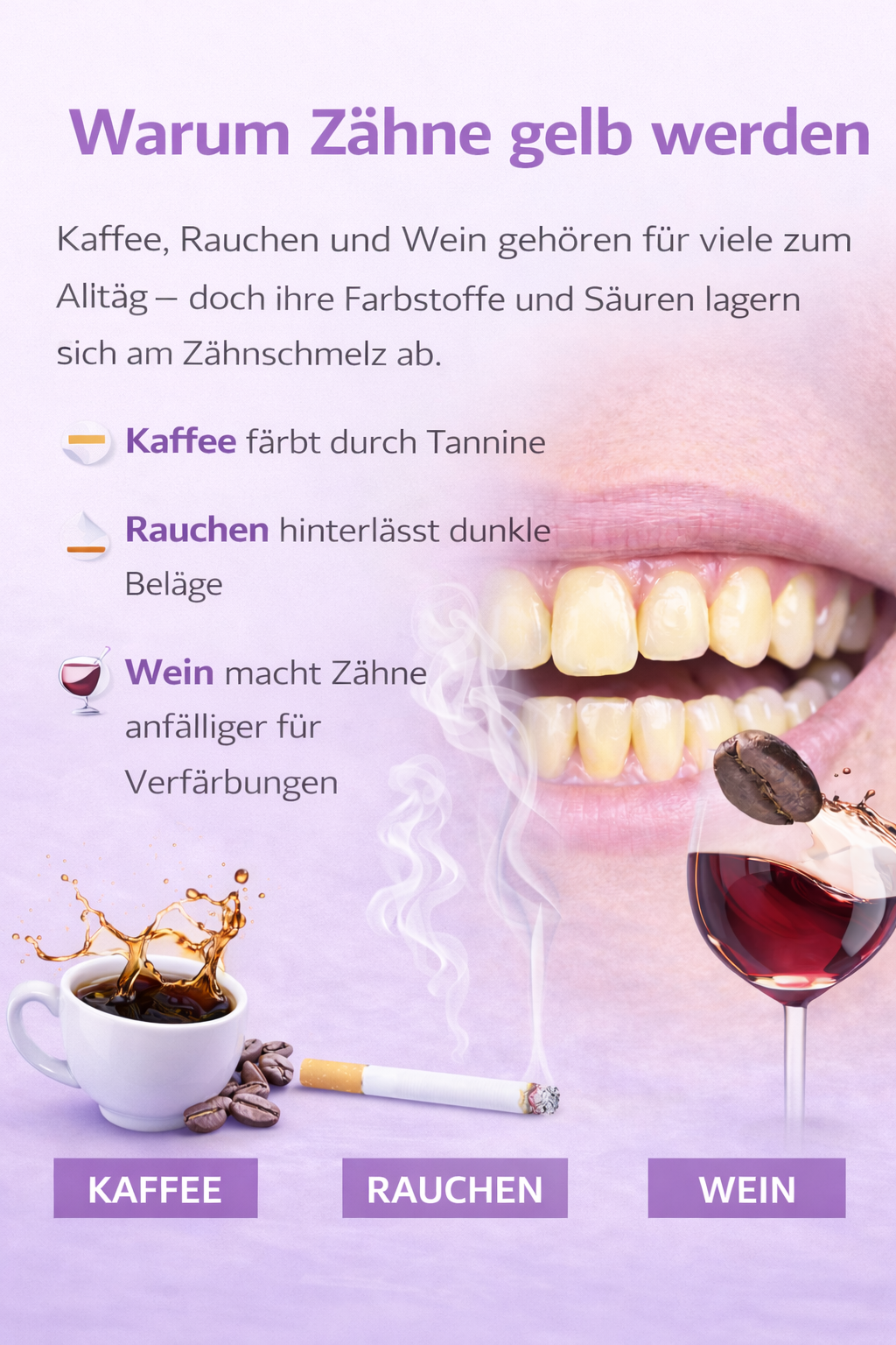Der auffälligste Effekt des Kaffeetrinkens ist eine gelbliche bis bräunliche Verfärbung der Zähne. Zahnverfärbungen durch Kaffee werden durch Farbstoffe, sogenannte Tannine ausgelöst.